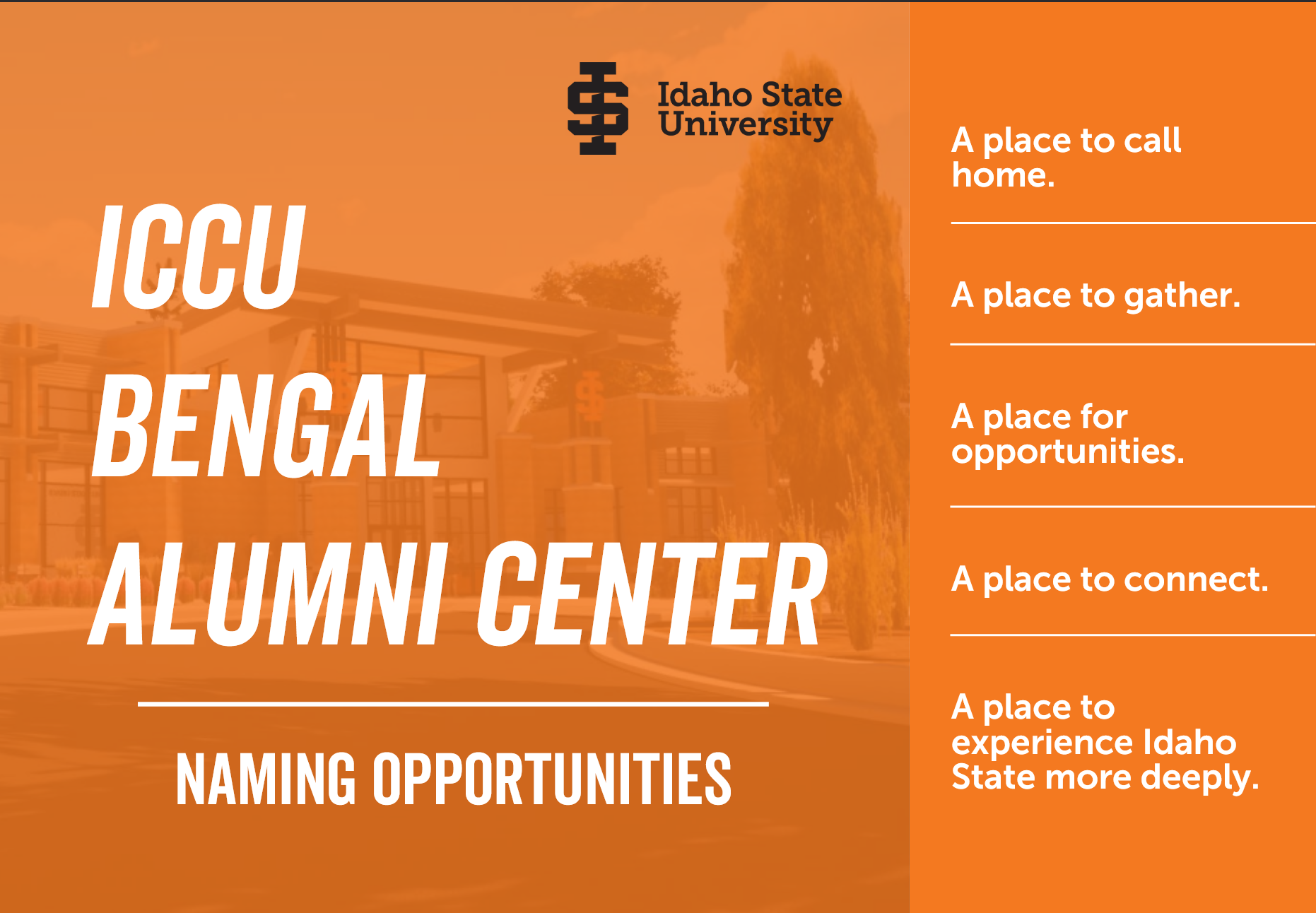 Writing and visual design for a handout soliciting donations to build the ICCU Bengal Alumni Center. Inviting, professional tone and concise, detailed information regarding construction and donor specifics. Distributed in the leadup to ICCU Bengal Alumni Center construction.