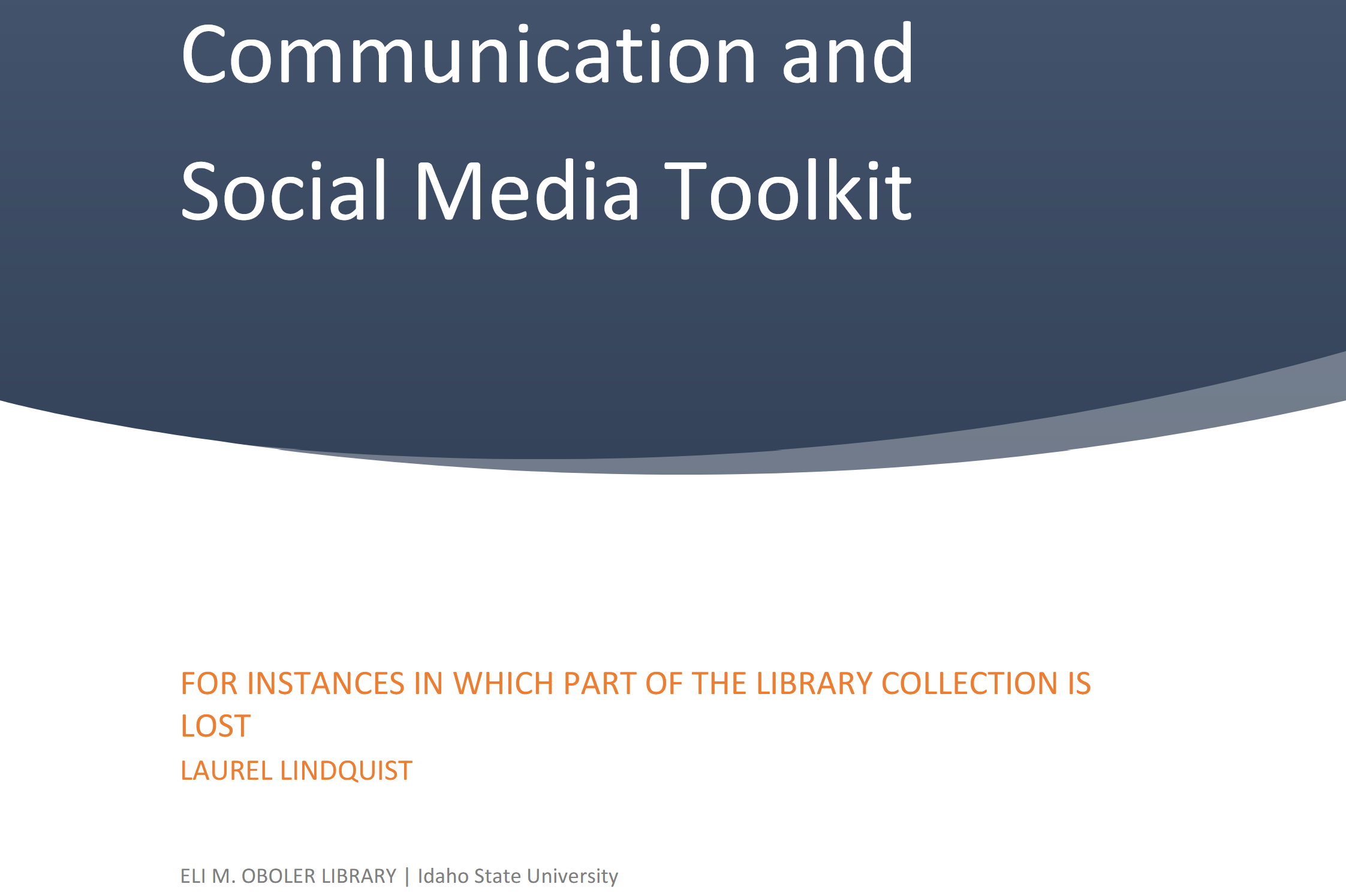 A full vertical slice of written business communications and community outreach for a fictionalized version of the Eli M. Oboler library. Professional writing coursework.